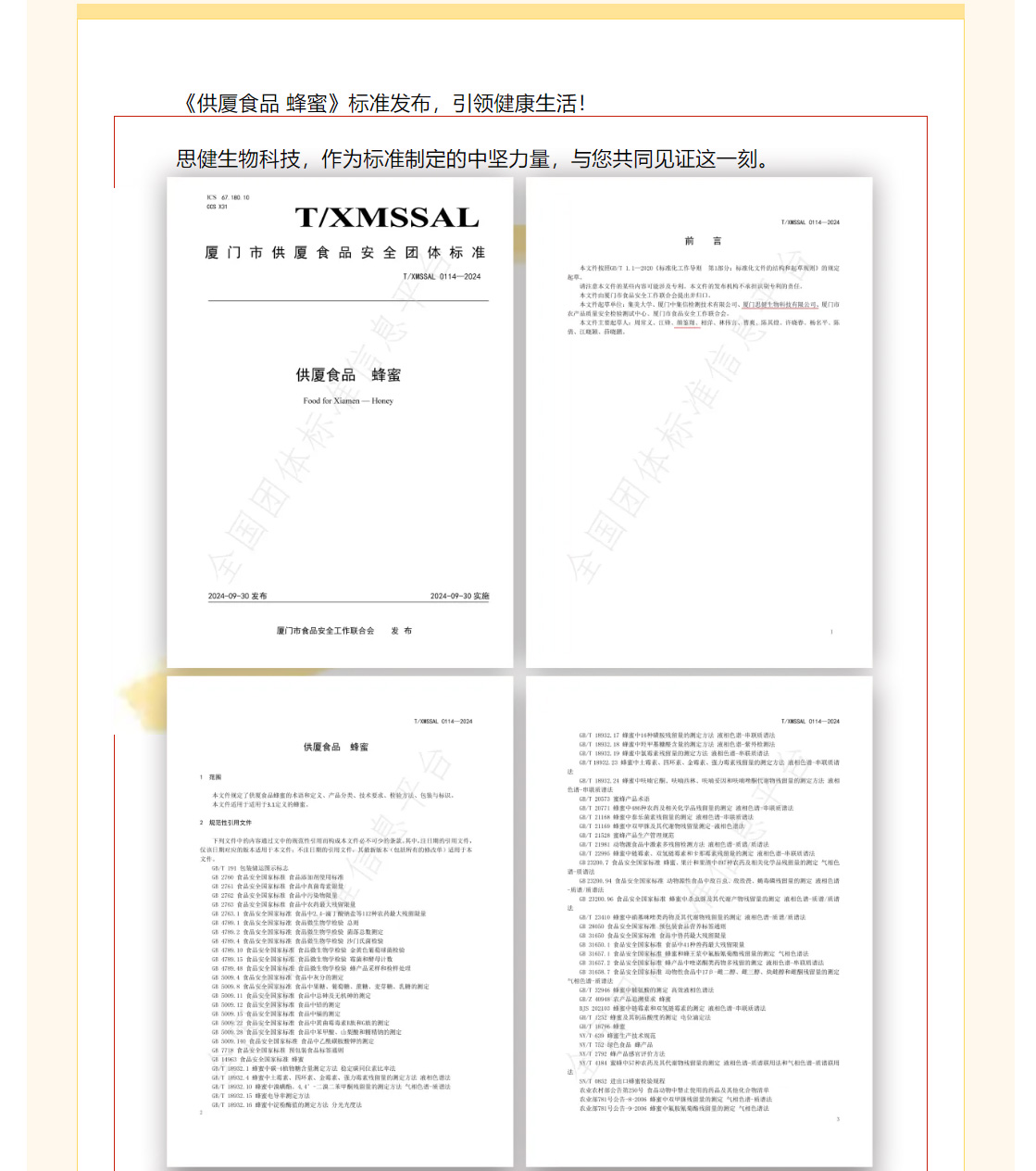 快訊:供廈標準《供廈食品 蜂蜜》 2024-9-30發(fā)布實施 思健生物科技很榮幸參與該標準制定
