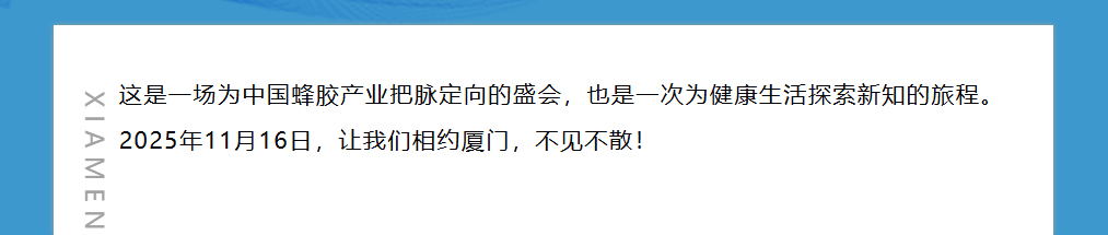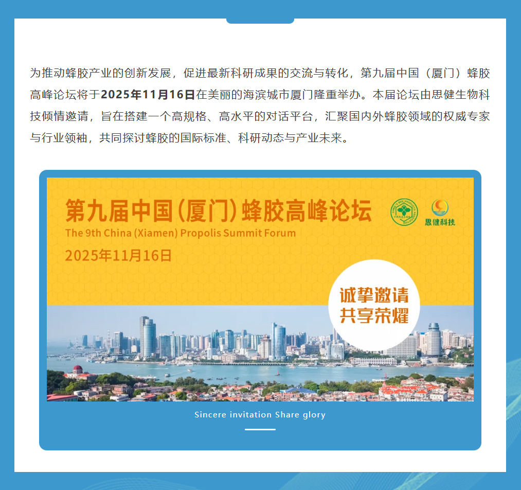 思健生物科技誠邀您共赴廈門出席第九屆中國(廈門)蜂膠高峰論壇:與蜂業(yè)權(quán)威面對(duì)面,洞見蜂膠國際新未來